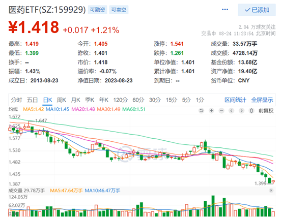 热门ETF方面,跟踪中证医药指数的医药ETF(159929)涨1.21%,四连阴后首次反弹,盘中一度跌破1.4的整数关口,创下4年多新低1.399,目前成交额超4700万。