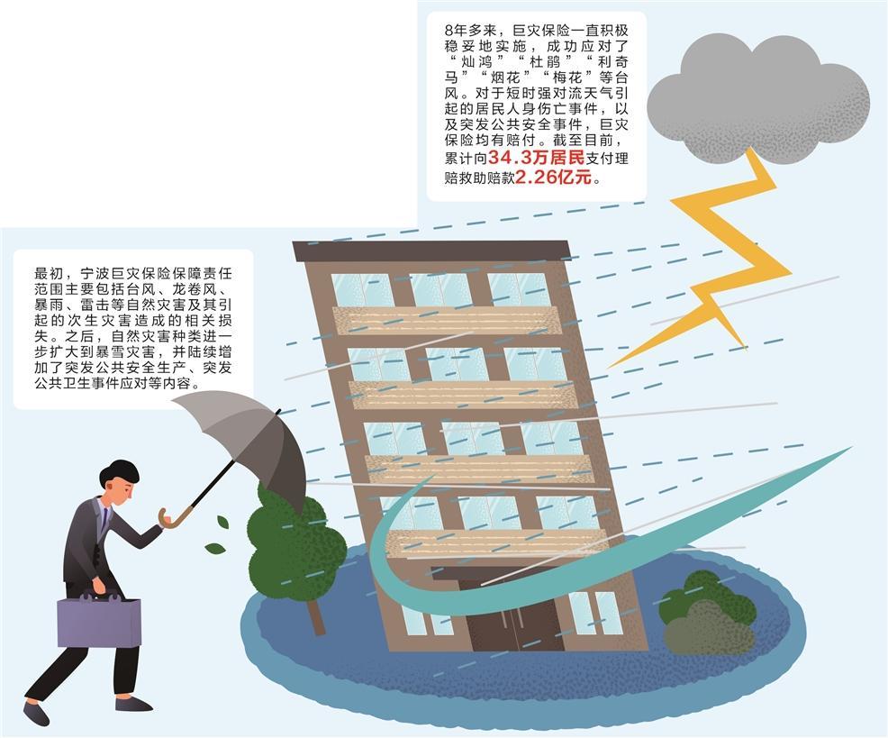 宁波市应急管理局减灾救灾处处长郭建民告诉记者,作为全国巨灾保险的试点城市,宁波探索巨灾保险较早,保障内容既涵盖居民家庭财产损失,也包含人身伤亡责任,且不同于传统的财产和人身保险,更突出产品的公共属性,体现灾害救助特色。