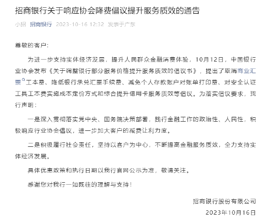 10月16日金融一线消息,招商银行(32.310,-0.30,-0.92%)发布公告称,积极响应行业协会倡议,进一步加大客户的减费让利力度;积极履行社会责任,坚持以客户为中心,不断提高金融服务质效,全力支持实体经济发展。