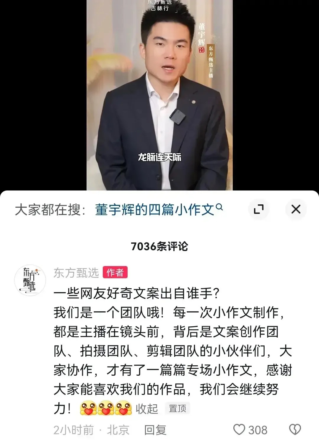 东方甄选的小编当时在评论区回应说是出自于团队之手,“每一次小作文制作,都是主播在镜头前,背后是文案创作团队、拍摄团队、剪辑团队的小伙伴们,大家协作,才有了一篇篇专场小作文。”