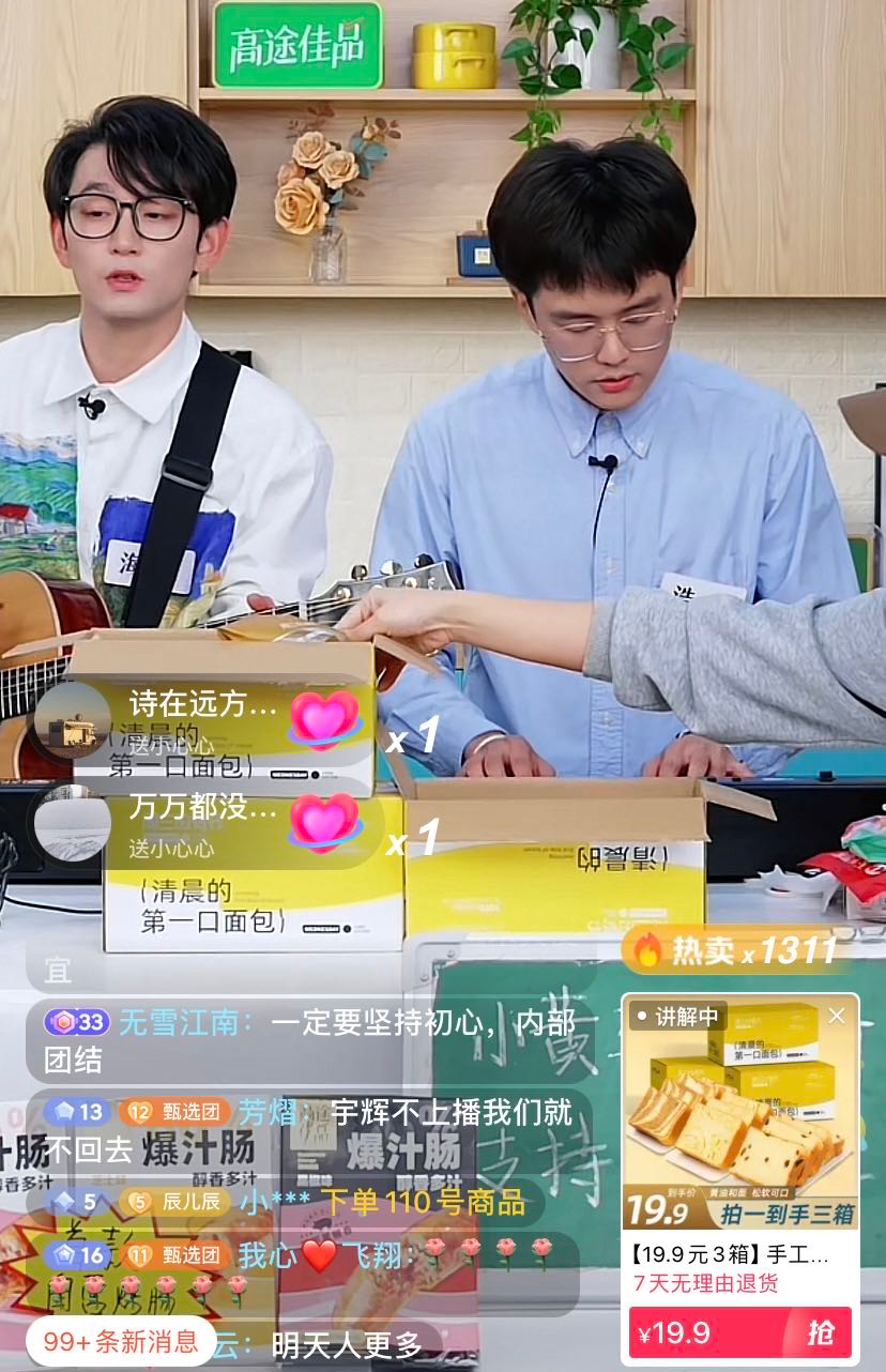海川和浩天也没想到当晚会有这么多人涌进直播间,他们是高途佳品当晚直播的两位主播,已经直播了三个小时的两个人,面对最高1.3万的在线人数,他们诚惶诚恐,非常害怕说错话,“我说出去的每一句话,现在都需要去负责”,也在直播间多次对观众说“是我们播得好吗?您各位抬举我们了,感谢各位的抬爱”。