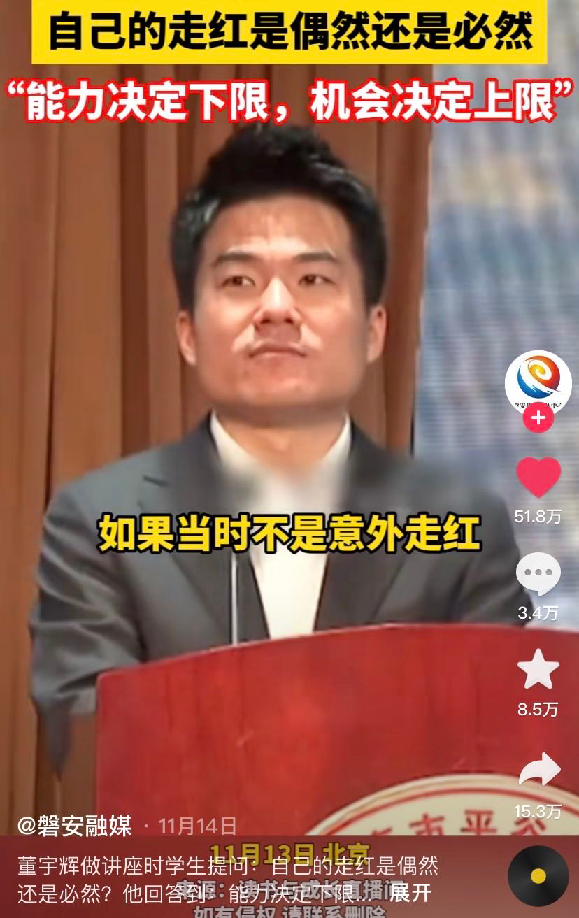 饭圈的本质是造神,走红后的董宇辉也顺着这条逻辑成为了流量喧嚣下的又一个“神”,媒体和公众的关注也让董宇辉的个人影响力持续扩大。尽管董宇辉自己是警惕这种造神神话,董宇辉多次把自己的走红归因于偶然和运气,“如果当时不是意外走红,不是被几千万网友关注,我当然没有机会成为一个被全国很多人知道的人”。不久前董宇辉还在清华大学演讲时坦言,自己是经历了长途跋涉,才终于站在了这里,人生没有捷径。