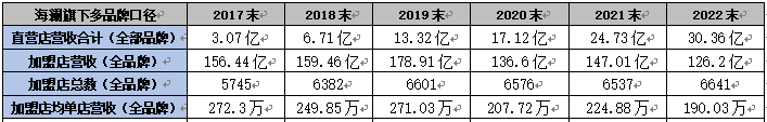 2017年度,海澜的线下门店营收(全口径:包括所有品牌,直营与加盟之和)是159.52亿元。五年后的2022年度,海澜的线下门店全口径营收是156.56亿元。这两个数值看似变动不大。但在5年期间,海澜的直营门店营收(全口径)从3.07亿元,上升到了30.36亿元。加盟门店营收,从156.44亿元,下降到了126.2亿元。加盟店的平均单店营收从2017年的272.3万元,下降到了2022年的190.03万元。