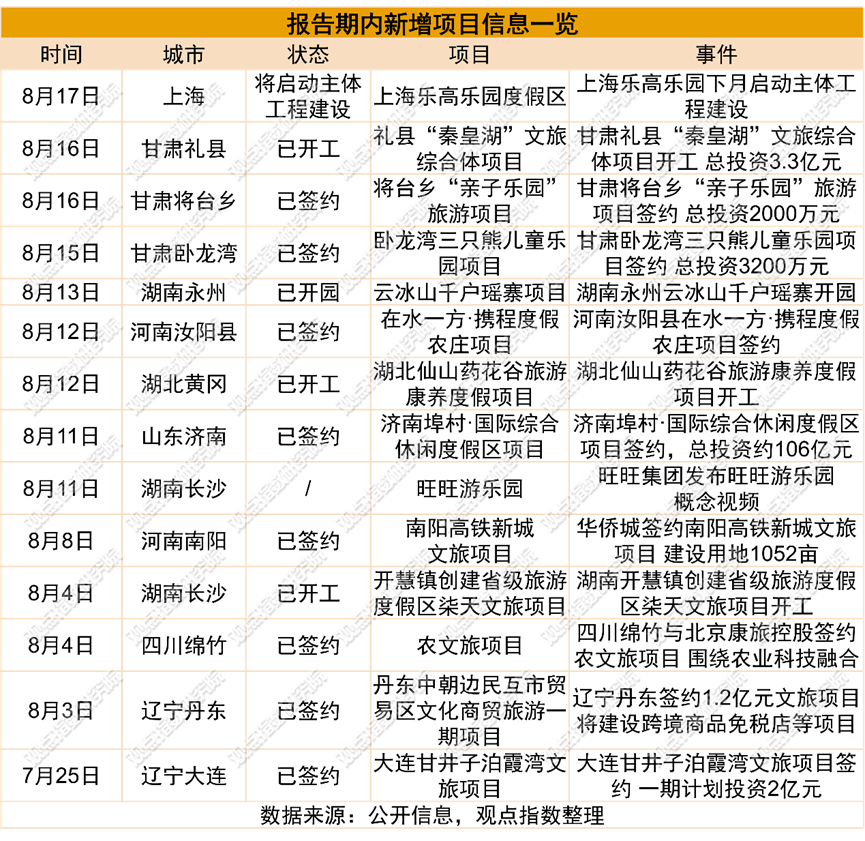 从项目的定位来看,可以发现期内多个如甘肃礼县、甘肃将台乡、湖南永州、山东济南、四川绵竹的项目,均表示将依托当地的自然生态资源,引入现代的休闲度假、主题游乐等业态,这和以往新增的项目主要是限定主题的乐园有明显不同。