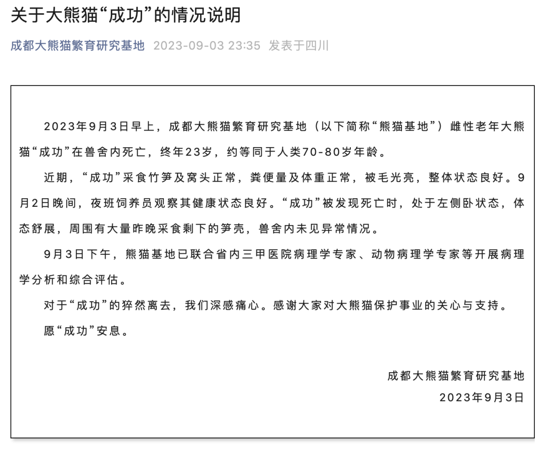 9月3日晚,成都大熊猫繁育研究基地发布消息称,2023年9月3日早上,成都大熊猫繁育研究基地雌性老年大熊猫“成功”在兽舍内死亡,终年23岁,约等同于人类70-80岁年龄。