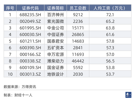 按照以上公式,高薪公司第1名是百济神州,2023年前三个季度,人均薪酬72万元。这是一家创新药企业,虽然目前没有盈利,但技术实力雄厚。第2名紫光国微(67.330,-0.52,-0.77%)是芯片设计公司,人均薪酬65万元。