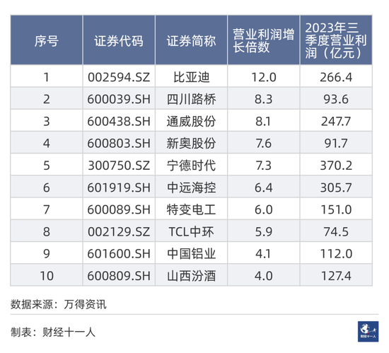 对比2019年同期,2023年营业利润增长倍数最高的公司为比亚迪,增长了12倍。营业利润增长十强中,比亚迪、通威股份、宁德时代、TCL中环(15.100,-0.31,-2.01%)四家公司与新能源大发展有关。