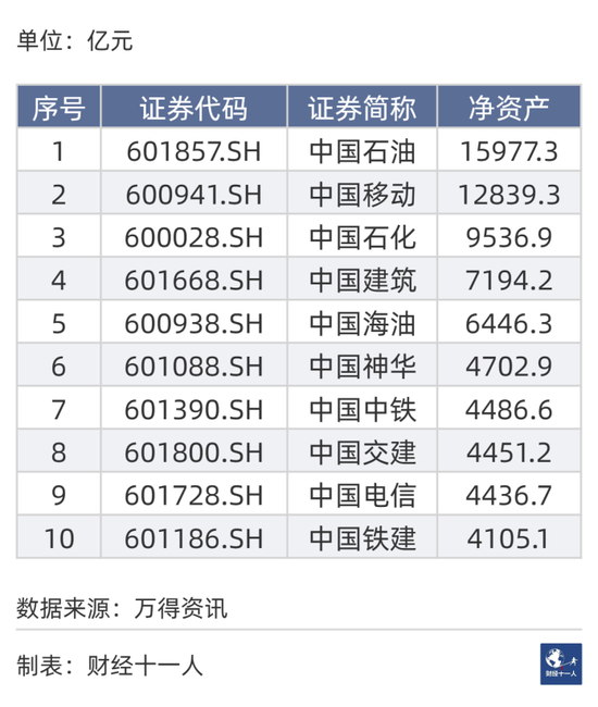 十大净资产中,有4个能源公司:中国石油,中国石化,中国海油(19.590,-0.25,-1.26%),中国神华(30.890,-0.36,-1.15%);有2个通讯:中国移动,中国电信(5.220,-0.03,-0.57%);4个建筑:中国建筑(4.820,-0.03,-0.62%)、中国中铁(5.580,-0.05,-0.89%)、中国交建(7.680,-0.05,-0.65%)、中国铁建(7.580,-0.06,-0.79%)。