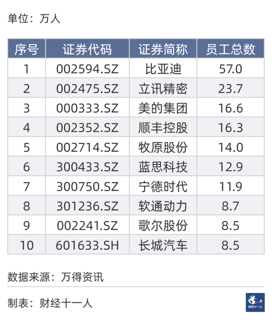 比亚迪员工总数57万人,是民企第1,也是所有A股第1。在全部A股公司中,员工第2名是中国移动,员工总数为45万人,第3名是农业银行,员工总数为44万人。
