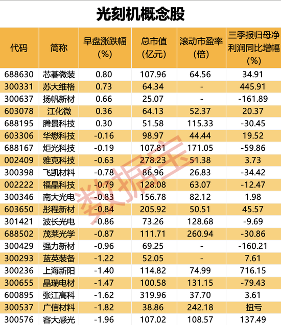 业绩上来看,12只光刻机概念股三季报实现盈利增长,上海新阳(36.260,-0.90,-2.42%)、苏大维格、容大感光(43.370,-0.93,-2.10%)增幅居前,均超过100%。