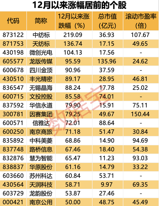 数据宝统计显示,截至今日早盘,A股中有20股本月以来股价累计涨幅达到50%以上,中纺标(40.370,4.77,13.40%)、天纺标(21.070,4.86,29.98%)、微创光电(11.070,2.55,29.93%)3只北交所个股股价已实现翻倍。