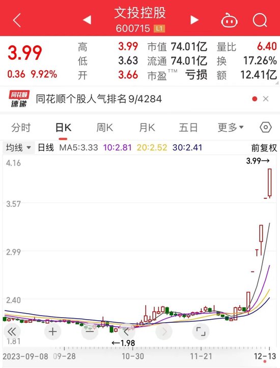 该公告发布后,今日早盘文投控股无惧风险,股价继续走高,开盘十分钟内封死涨停,收盘仍有30.95万手买单封板,封板资金达到1.23亿元。12月1日以来,文投控股已累计上涨85.58%,成为近期表现最好的个股之一。