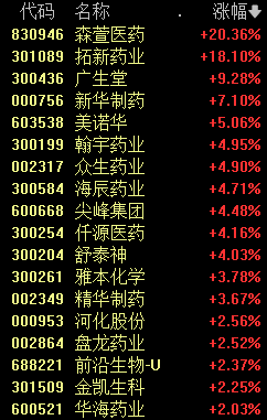 今天上午,医药股全面上涨,流感、中药等板块涨幅居前。
