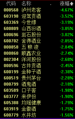 今天上午,白酒板块调整明显,泸州老窖(174.300,-10.16,-5.51%)、五粮液(133.780,-5.52,-3.96%)、贵州茅台(1660.000,-49.99,-2.92%)等龙头股都下跌。
