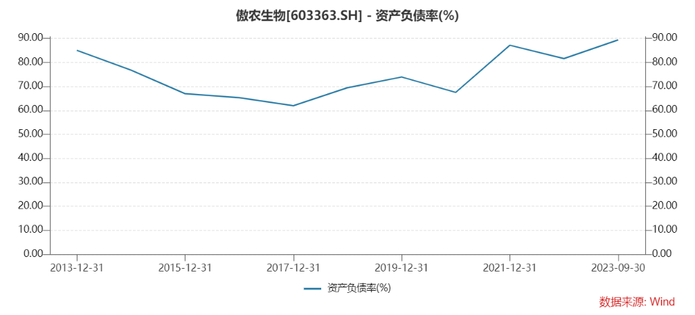 年初至今,傲农生物境遇每况愈下。2023年三季度末,傲农生物负债率高达89%、创历史新高,短期借款40.51亿元、流动负债115.5亿元,货币资金仅有2.995亿元。