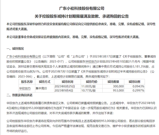 小崧股份表示,华欣创力上述减持原因是履行其债务偿还义务,公司前期已披露减持预披露公告。上述减持中,华欣创力于2023年9月4日减持公司股份95.3万股的减持行为违反了中国证监会《进一步规范股份减持行为》相关要求。华欣创力已深刻认识到本次违规减持公司股份的错误,对本次失误减持表示真诚的歉意,并作出购回违规减持股份承诺。