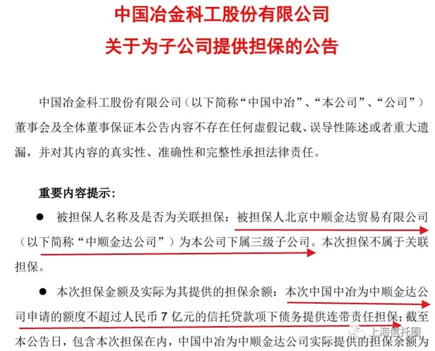 2023年12月8日,中国中冶与昆仑信托有限责任公司签订保证合同,由中国中冶就中顺金达公司在该信托贷款项下的债务提供连带责任担保。
