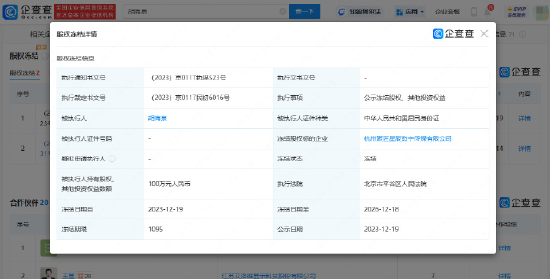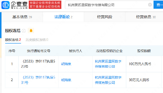 企查查APP显示,近日,胡海泉新增一则股权冻结信息,股权被执行的企业为杭州聚匠星辰数字传媒有限公司,冻结股权数额100万元,冻结期限自2023月12月19日至2026年12月18日,执行法院为北京市平谷区人民法院。此外,不久前胡海泉所持该公司30万股权已被冻结,同样涉及财产保全执行案件。企查查信息显示,该公司成立于2020年6月,法定代表人、董事长为胡海泉。